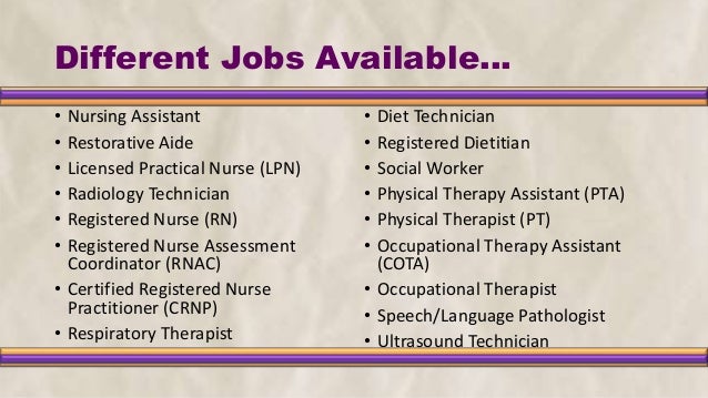 Should you work at an SNF? There are many careers available with skilled nursing facilities, According to Aging Care, in addition to full times and travel nursing jobs, occupational therapy jobs, medical directors, practical and vocational nurses, physical therapists, speech-language pathologists and audiologists are needed on staff. ... Fetch Doc