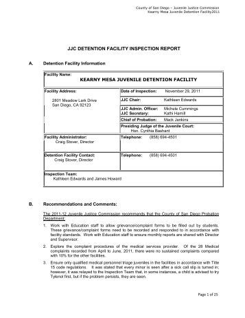 Kearny Mesa Juvenile Detention Facility 2015 Page 1 of 32 San Diego County Juvenile Justice Commission 2015 Inspection According to Welfare and Institutions Code 229, the Juvenile Justice Commission conducts annual inspections of the juvenile detention facilities in San Diego County. It shall report the ... Access This Document